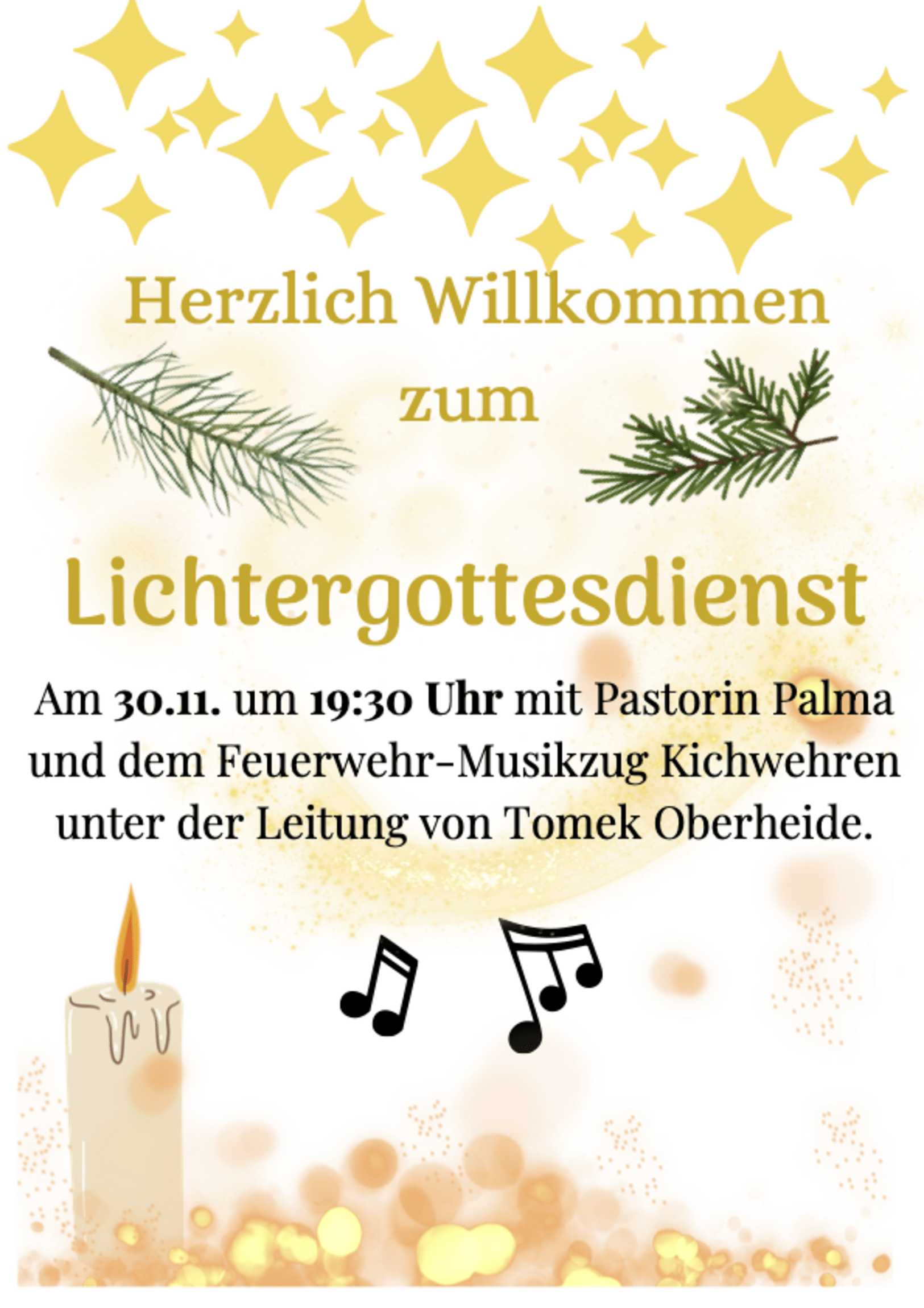 Herzlich Willkommen zum Lichtergottesdienst am 30.11. um 19:30 Uhr mit Pastorin Palma und dem Feuerwehr-Musikzug Kirchwehren unter der Leitung von Tomek Oberheide.