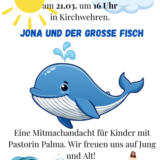 Am Samstag, den 21. März, haben wir in der Kirche die Geschichte von Jona und dem großen Fisch gehört und kreativ gestaltet. Jona hatte Angst – so wie wir alle manchmal. Doch Gott hat ihn nicht allein gelassen. Diese Zusage gilt auch für uns heute: Gott ist bei uns. Und er freut sich, wenn wir freundlich miteinander umgehen und füreinander da sind.