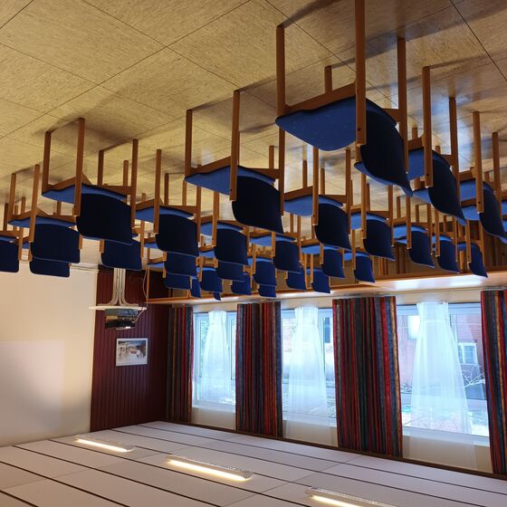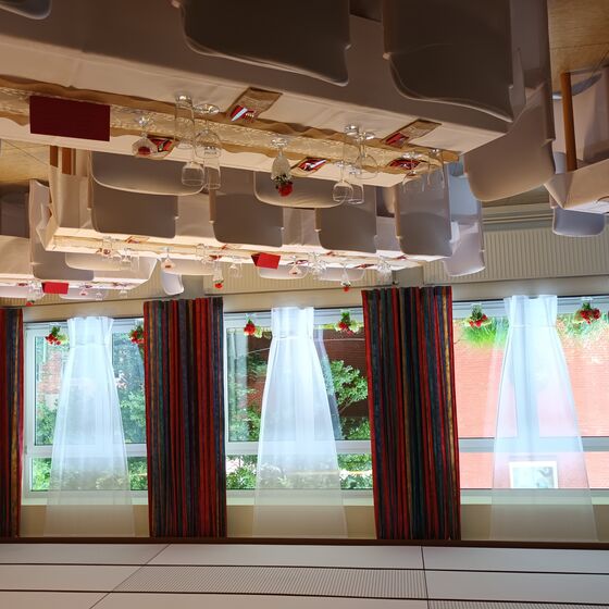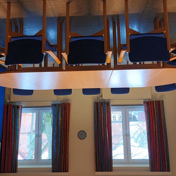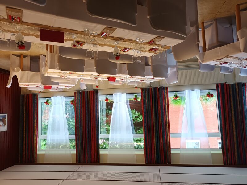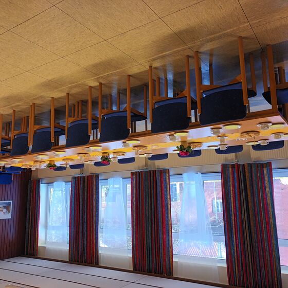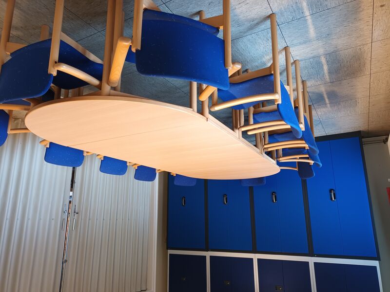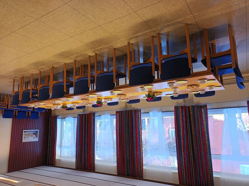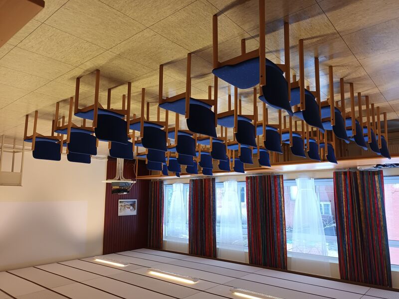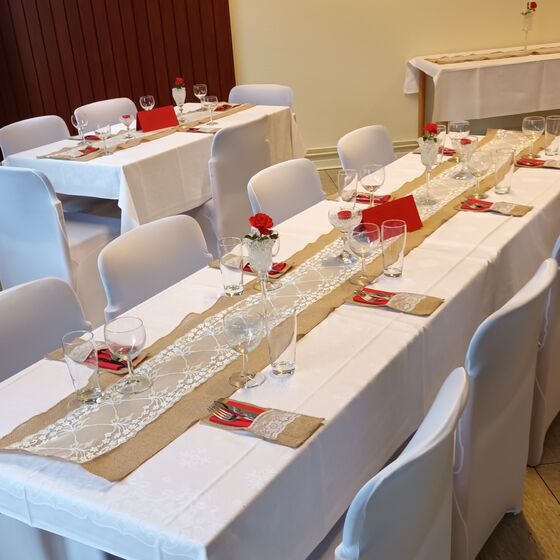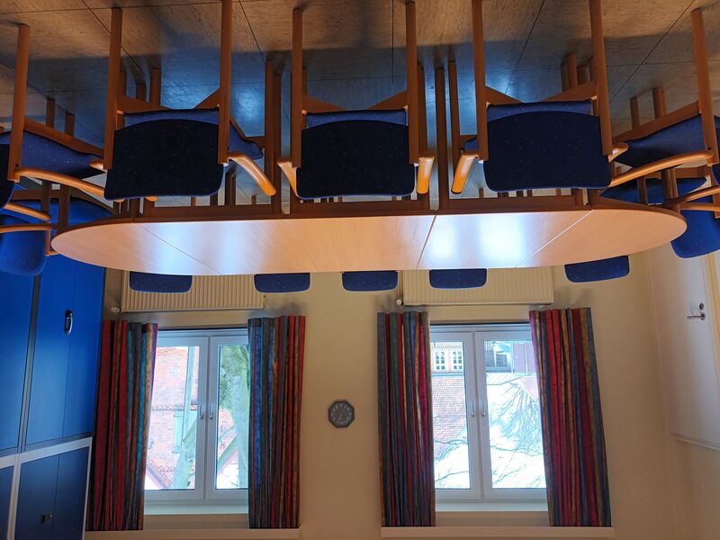 Abgetrennt durch eine Schiebetür befindet sich der kleinere Raum mit einer Größe 25 qm (5,60 x 4,50 m). Vom großen Raum abgehend ist die Küche untergebracht. Diese ist ausgestattet mit einem Elektroherd, Kühlschrank und Geschirrspüler und Kaffeemaschinen. Die Räumlichkeiten, Kaffeegeschirr und Bestecke sind für ca. 50 Personen ausgelegt.