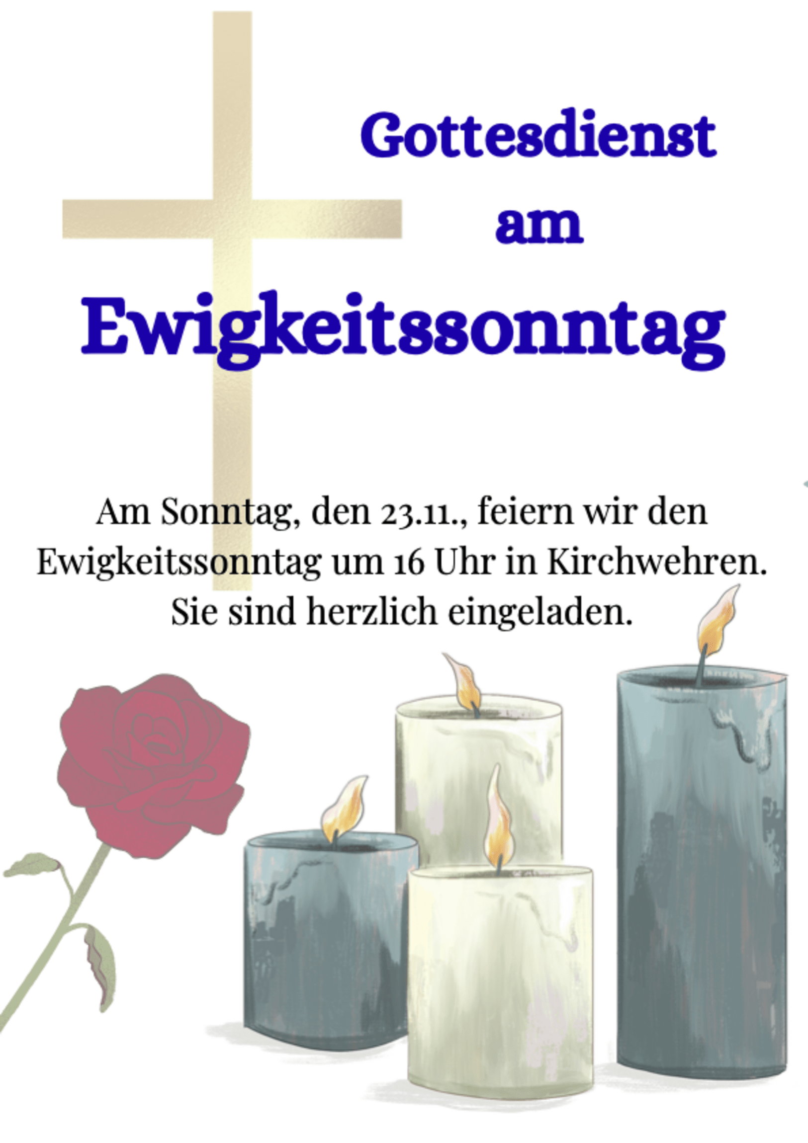 Herzlich Willkommen zu einem Gottesdienst am Ewigkeitssonntag um 16 Uhr in Kirchwehren.